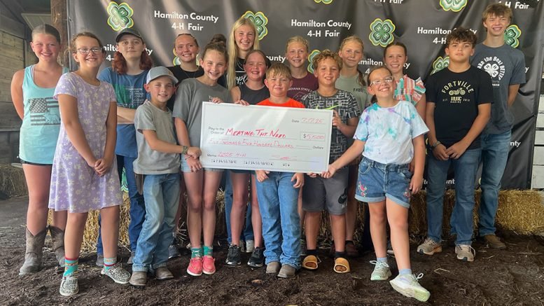 These 4-H kids who designated their livestock projects to go to the Meating the Need program took a few minutes out of their busy fair schedules to accept this year’s donation check on behalf of Hamilton County Harvest Food Bank. (Reporter photo)