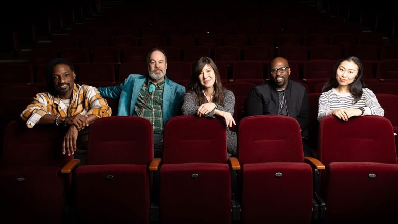 Winners of the 2026 New Works arts commissions at Allied Solutions Center for the Performing Arts are (from left) Justin David Sears, Kyle Ragsdale, Mina Keohane, Brandon Meeks, and Saki Morimoto. (Photo by Joshua Hasty)