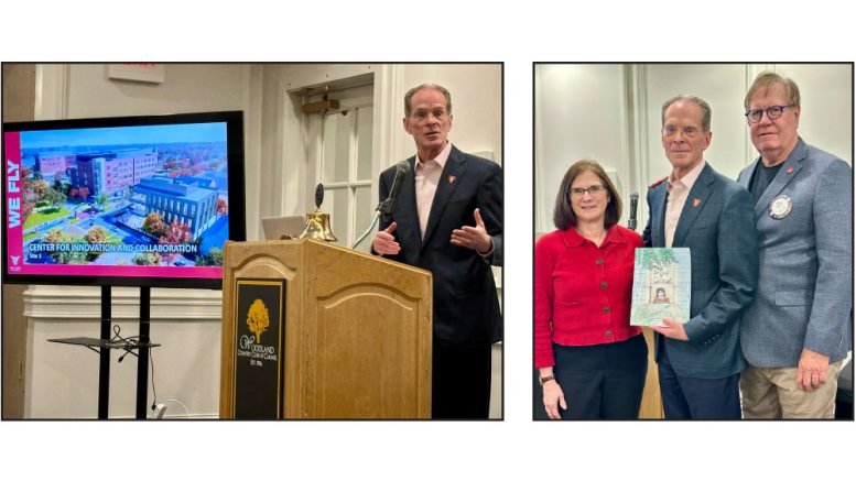 (ABOVE LEFT) Ball State University President Mearns reviews campus improvements. (ABOVE RIGHT) Rotarian Tammy Haney, BSU President Mearns, and Rotarian and BSU alum Jay Brill, who introduced Mearns. (Photos provided)
