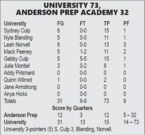 The Trailblazers’ defense took over in the second period, limiting Anderson Prep to three points. University led 44-15 at halftime, then began the third quarter with a 12-4 run. A Sydney Culp basket put the Blazers ahead 54-19, instituting a running clock.