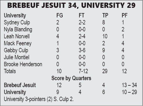 The University girls dropped a defensive slugfest Tuesday night at The U Center, falling 34-29 to Brebeuf Jesuit.