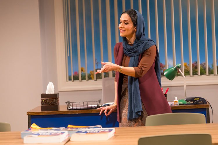 English takes place in Karaj, a suburb north of Tehran, but all of the action occurs inside of one classroom. This classroom belongs to Marjan, an instructor for advanced English speakers who is helping her students prepare for the TOEFL exam (Test of English as a Foreign Language). Each of her four students has a unique and compelling reason for taking the course, which is revealed as the 90-minute, one-act play unfolds.