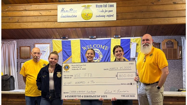 The Wayne-Fall Lions Club presented a check to the Hamilton Southeastern FFA last Wednesday night, March 25, for the proceeds made at the Feb. 28 Chicken and Noodle Dinner, which was served by the HSE FFA at the Lions Club. (From left) Wayne-Fall Lions Club Vice President Bill Daniels, HSE FFA Member Charlie Fletcher, HSE FFA President Lizzie Dekker, HSE FFA Secretary Liam Kenyon, and Wayne-Fall Lion Matt Haas.