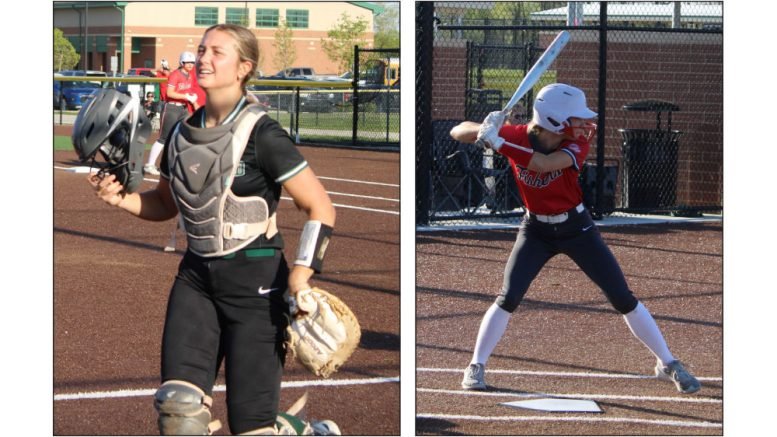 (LEFT) Westfield catcher Carlynne Schrock made a tag-out at home for the Shamrocks during the second inning of their game with Fishers on Tuesday. Westfield won the game 15-5. (RIGHT) Fishers’ Kennedy Shockley was one of five Tigers that hit a double during the game. (Richie Hall)