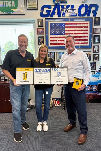 (From left) The Feeding Team Co-Founders Mark and Lisa Hall presented the Premier Partner Award to Gaylor Electric CEO Chuck Goodrich. (Photo provided)