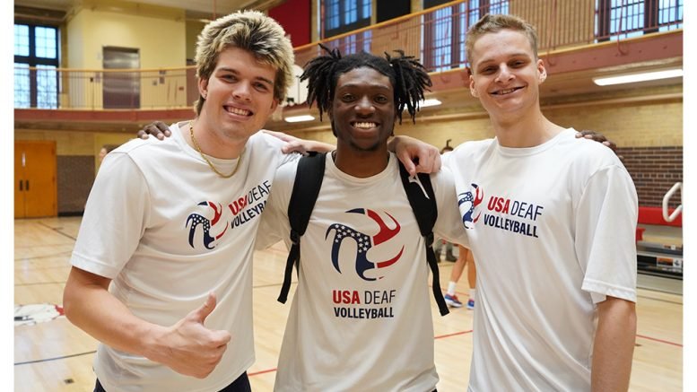 Noblesville’s Tyler Wascher (left) and Fishers’ Zachary Bippus (right) went from beginners to national competitors in volleyball. The two began playing volleyball last year, but are now members of the U.S. Men’s Deaf National Volleyball Team. Wascher and Bippus, pictured with fellow national team player Martavion Boyd (center), will represent the U.S. this November in the Deaflympics, which take place in Tokyo. (Photo provided)