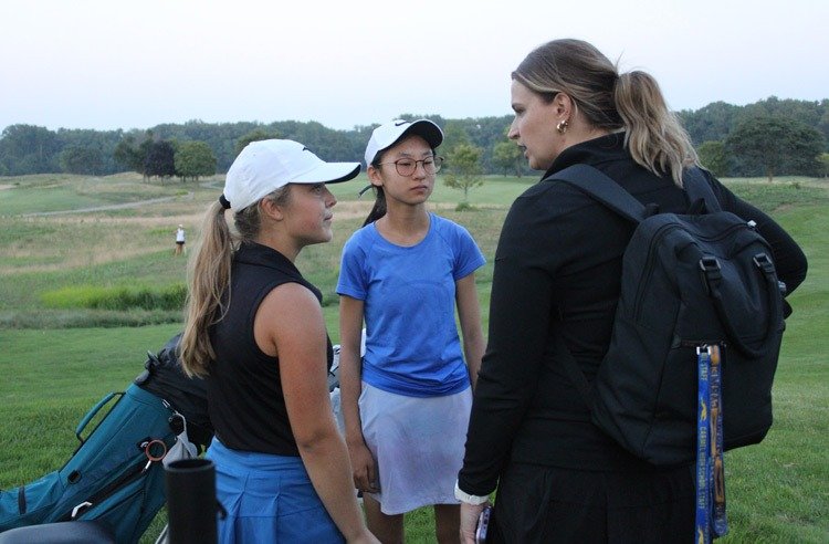 Carmel golfers Kate Harding (left) and Ishin Fujita (center) talk with assistant coach Taylor Pietruch during tryouts for the Greyhounds golf team Friday at Prairie View. (Richie Hall)