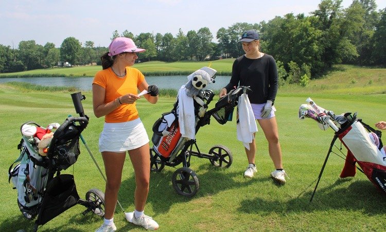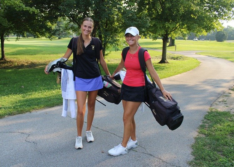 Hamilton Heights juniors Samantha Powers (left) and Taylor Morrison prepare to tee off during Friday’s first practice. (Richie Hall)