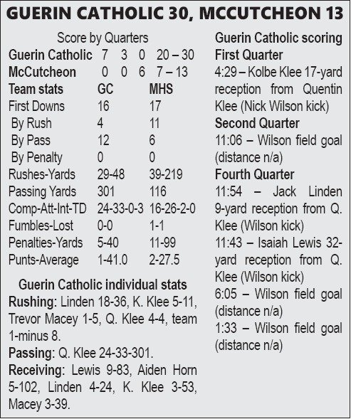 But the Golden Eagles surged ahead with two touchdowns during the first few seconds of the fourth. Quentin Klee connected with Jack Linden for a nine-yard touchdown pass. Guerin Catholic got the ball back seconds later, and Quentin Klee struck again, tossing a 32-yard touchdown throw to Isaiah Lewis.