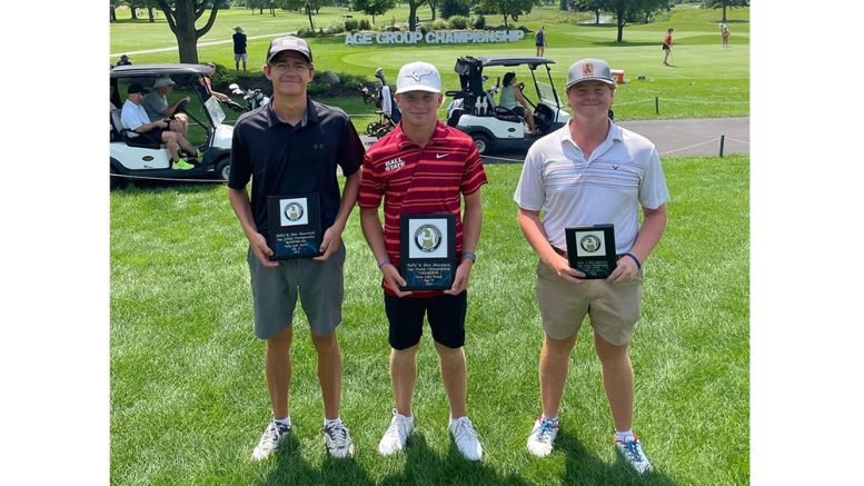 Fishers’ Mattingly Upchurch (center) won the Boys 17 division at the Buffy & Alice Mayerstein Age Group Championships, which took place last Tuesday and Wednesday at Swan Lake Resort in Plymouth. Upchurch finished with a seven under par 137 for the two-day, 36-hole tournament. Also pictured are Fort Wayne’s Gavin Haflich (left), who finished second and Noblesville’s Jackson Mahan (right) who tied for third. (Photo provided)