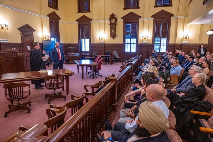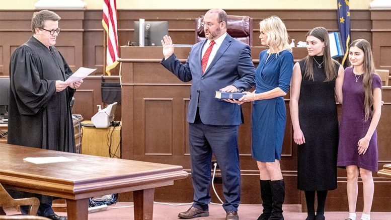 Superior Court 2 Judge Jonathan M. Brown swears-in Josh Kocher as the new county prosecutor on Tuesday, Dec. 30, as Kocher’s family looks on. (Photo courtesy Peter M. Michael, IN Dancing Light Photography)