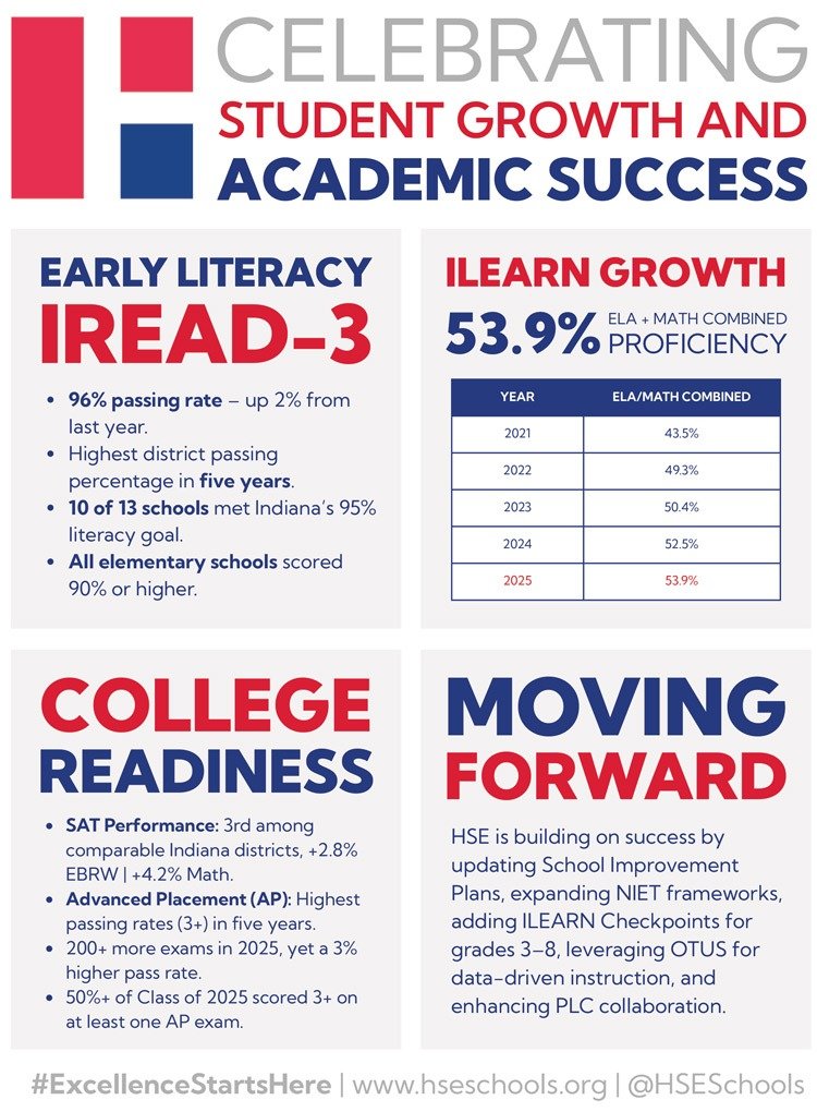 Recent results highlight strong gains in early literacy, math, and college readiness. HSE students achieved a 96 percent passing rate on IREAD-3, the highest districtwide performance in five years. ILEARN scores continue to trend upward with notable growth across nearly every grade level and student demographic group. Both high schools also recorded their highest Advanced Placement passing rates in five years, and SAT performance remains among the strongest in the state.