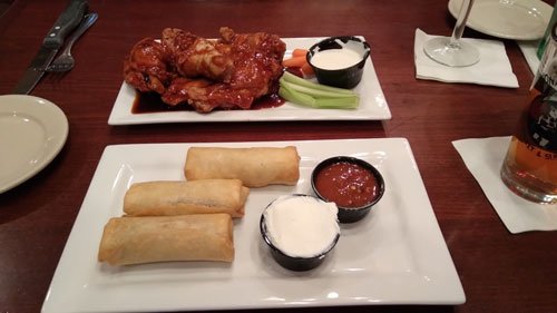 We decided on the Wings ($8 for five) with a teriyaki sauce, and the Southwest Chicken Eggrolls ($12 for three). Basically, the prices are one-half off the regular menu prices for a one-half portion. Lots of places do that and it’s a good way for us to sample different things.