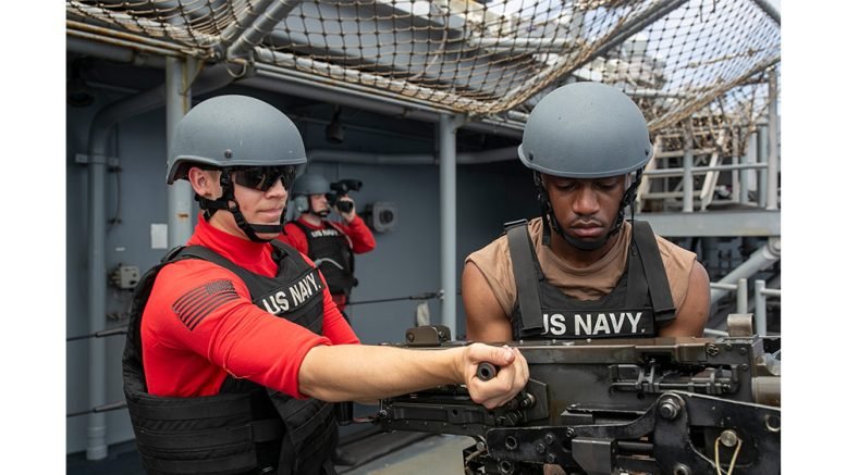 Aviation Ordnanceman Airman Christian Dunham (left), Indianapolis, and Aviation Ordnanceman 3rd Class Austin Bryant (right), Decatur, Ga., preform a small craft action teams (SCAT) drill during a general quarters drill aboard amphibious assault carrier USS Tripoli (LHA 7), June 20. Tripoli is currently underway in the Pacific Ocean forward deploying to Sasebo, Japan, as part of a scheduled rotation of force in the Pacific.