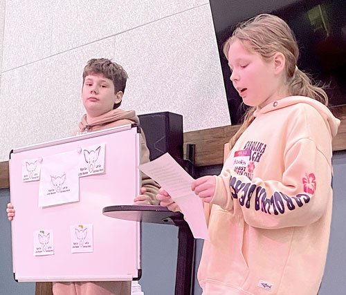 Colton and Brookyn Hoane demonstrated how to tell pigs apart. (Photo provided by Husky 4-H’ers)