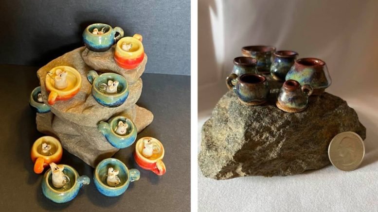 Indiana Artisan clay artist Sue Scamihorn made her mark in the world of miniatures, and she professes that she cannot make a full-sized mug. When a friend gave her a miniature wheel a few years ago, mugs were soon part of her work.