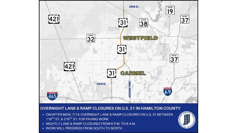 On or after Monday, July 14, overnight lane closures will begin on U.S. 31 between 116th Street and 216th Street in Carmel and Westfield. Lane closures are planned between the hours of 6 p.m. and 6 a.m. nightly. At least one lane will remain open to traffic while work is in progress. Overnight ramp closures are also planned as paving progresses from south to north.