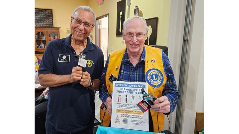 Noblesville Lions are collecting new, manual can openers to share with families who rely on local food pantries for support. Many families receive canned goods, but don’t own a working can opener. Community members can donate new, manual can openers at the entrance to Ginger’s Cafe during regular business hours. (ABOVE) Lions George Long and Bob Minton are among the first to donate can openers.