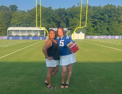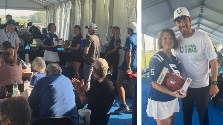 The Indianapolis Colts held a Volunteer Appreciation night on Wednesday at Colts Camp at Grand Park. Westfield’s own Lisa Everling was lucky enough to win a signed football from Colts running back Jonathan Taylor, and she even got Coach Shane Steichen to add his signature!