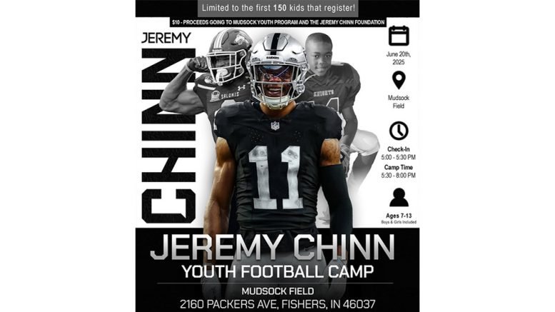 The Jeremy Chinn Youth Football Camp will take place on Friday, June 20, at Mudsock Football Field in Fishers. The camp is open to boys and girls ages 7 to 13. The $10 registration fee supports both Mudsock Youth Football and the Jeremy Chinn Foundation, which are committed to creating enriching opportunities for youth in the community. Space is limited.