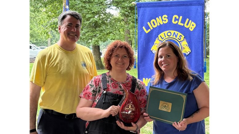 At the June 25 meeting, the Noblesville Lions Club presented the Indiana School for the Blind and Visually Impaired Fellowship award to the Hamilton-Boone-Madison Special Education Co-op. Accepting the award were Blind/Low Vision Teachers Shelby Metzler and Jennifer Abbott.