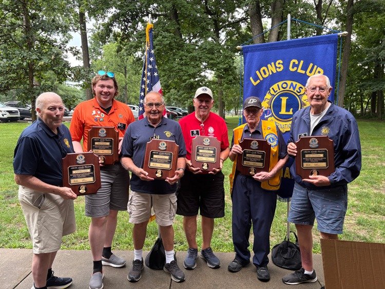 Members Stephen Craig, Josh Kozicki, Gene Beck, Steve Shaw, Bob Minton, and Rollin Cutter were presented with Melvin Jones Fellowships from the Lions Club International Foundation. Kozicki won his at the Indiana State Convention. The other Lions were honored for their dedication with a combined total of over 200 years of service.