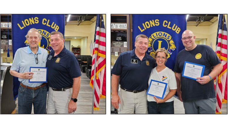 At the July 23 meeting, the Noblesville Lions Club heard a presentation about Noblesville Main Street from Executive Director Kate Baker and board member Chris Theisen. (ABOVE LEFT) Lion David Marsh was recognized by First Vice President John Einsfeld for his presentation on his travels to Malta, Italy and Turkey at the July 9 meeting. (ABOVE RIGHT) First Vice President John Einsfeld recognized Baker and Theisen for their presentations about Noblesville Main Street at the July 23 meeting.