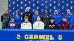 Five Carmel football players announced their college commitments during national signing day. Pictured in the front row are Flynn Hornsby (Taylor University), Dane Bathurst (Oklahoma University), Kaiden Bower (University of…