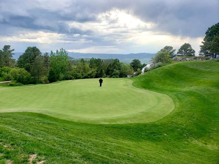 At a wedding in Colorado, Chuck Leonard, wearing his suit, checked out the green at the golf course, pondering a hole-in-one. (Photo provided by Janet Hart Leonard)