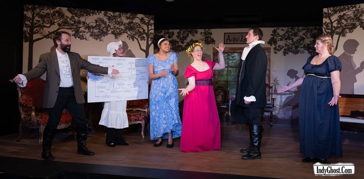 Kat Krebs, excellent in The Outsider here last year, amazes in all her seven personas (Caroline Bingley and Lady De Bourgh were my personal favorites) and what must be an exhausting back-and-forth between all of them. Tanya Haas, a staple of community theater for good reason, is appropriately overbearing and embarrassing as Mrs. Bennett, in particular. And Trinity Pruitt has the privilege of “only” being a lovely Elizabeth Bennett, showing a nice range of emotions in this dream role for many young women. Adrian Blackwell commits fully to his choices for his two characters, and Todd Isaac impresses in his variety of all the remaining male roles.