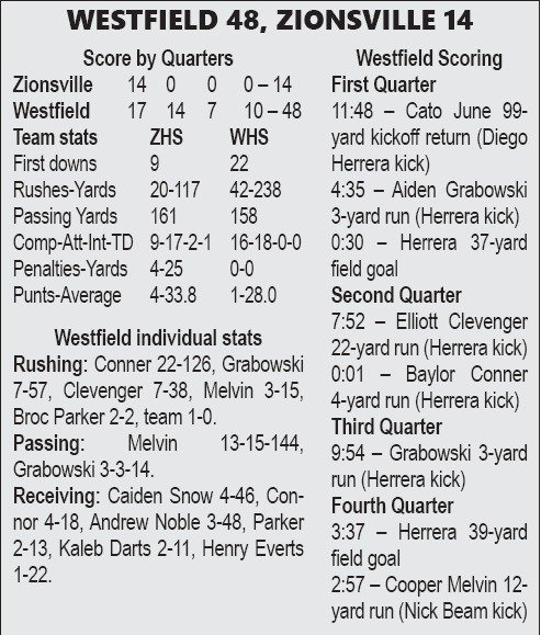 Westfield broke away from Zionsville after a tight first quarter and rolled to a 48-14 semifinal victory in Class 6A Sectional 3 Friday, Oct. 31 at Riverview Health Stadium.
