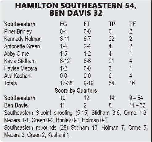 Kennedy Holman led the way for HSE with 22 points, seven rebounds and three blocked shots. Kayla Stidham reached double-double status with 21 points and 10 rebounds; she also totaled four blocks. Abby Orme collected five rebounds.