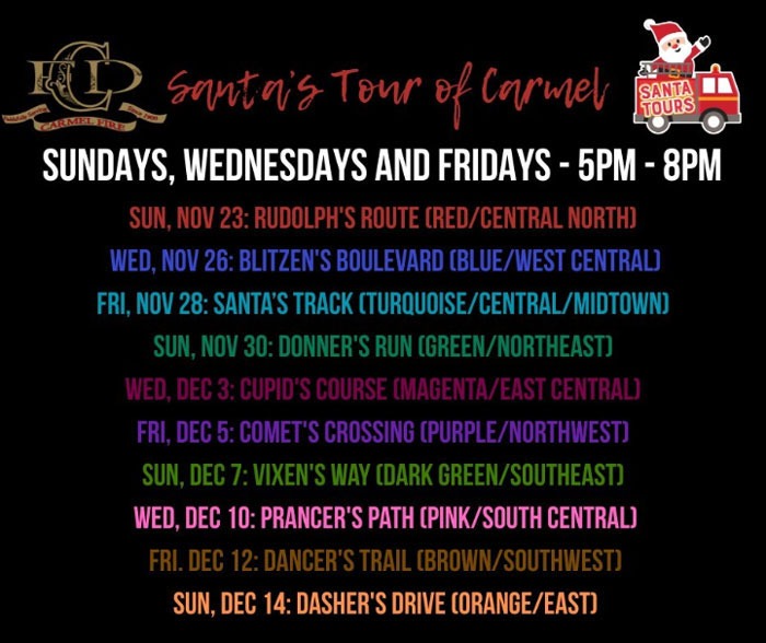 Mark your calendars as Santa returns to Carmel this holiday season with his friends from the Carmel Fire, Police and Street departments. The tours will begin Sunday, Nov. 23 and include 10 dates with 10 different routes through Sunday, Dec. 14. Each tour time will be from 5-8 p.m. on Sundays, Wednesdays and Fridays.
