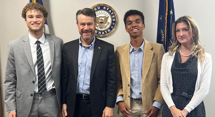The Indianapolis intern class: Eli Adams, Yoezer Cassell, and Georgia Carlson, joined by Sen. Young. (Photo provided by Office Sen. Young)