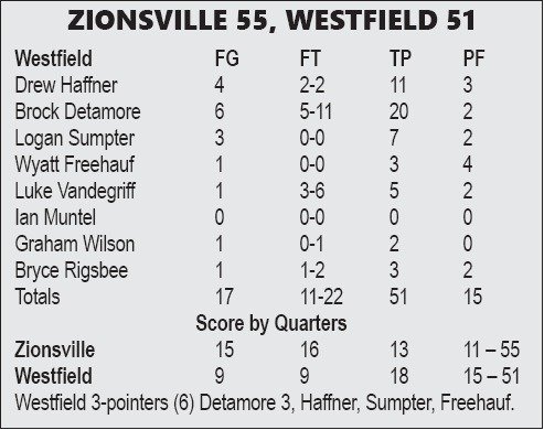 Westfield’s boys dropped their Hoosier Crossroads Conference opener to Zionsville 55-51 Friday, Dec. 5 at CSI Gymnasium.