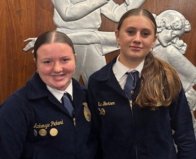 Sheridan Community Schools FFA members Eva Beckner and Landon Glunt earned top honors at the annual FFA State Convention after they won in the Discovery Degree Animal Science Demonstration category. Mackenzie Pickard accepted on behalf of Landon, along with Eva.