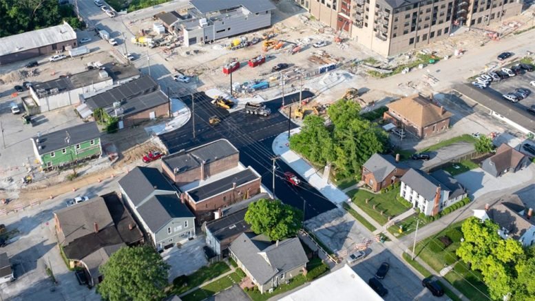 INDOT has been working with Duke Energy on the relocation of utilities and is aware of a pole placement in the road. This will be removed when utilities are buried as part of the utility relocation work, but it will not affect travel.