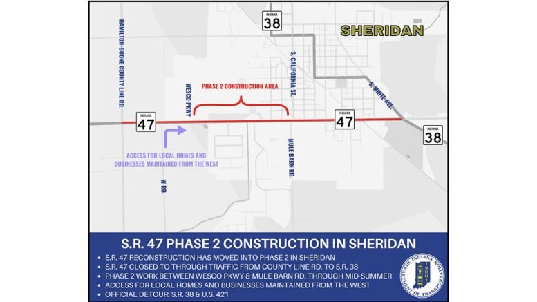 Phase 2 work includes a complete reconstruction of SR 47 between Wesco Parkway and Mule Barn Road. That work is expected to last through mid-summer. Through traffic remains closed between Hamilton-Boone County Line Road and State Road 38. Access for local homes and businesses will be maintained from the west.