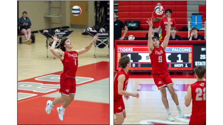 Fishers hosted Perry Meridian on Thursday and were swept by the Falcons in three sets (25-17, 25-22, 25-18). Pictured are Tigers seniors Jack Powell (7) and Ethan Luenemann (9).