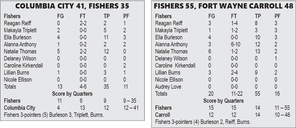Fishers came back to beat Fort Wayne Carroll 55-48 in its second game. The Tigers led 15-12 after the first quarter, with Burleson scoring seven points. Fishers went up 30-24 by halftime, then led 44-38 after three periods.