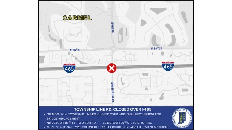The Township Line Road bridge over Interstate 465 just south of 96th Street is now closed for a replacement project in Indianapolis.