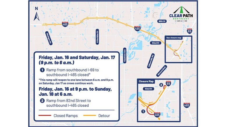 Significant ramp and ramp lane closures are scheduled this weekend to allow INDOT crews to shift traffic onto a new ramp and bridge from southbound Interstate 69 to southbound I-465 in northeast Indianapolis.