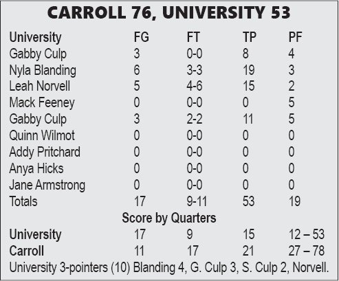 The Blazers made five three pointers in the first quarter, opening up a 17-11 advantage. Gabby Culp hit three triples and Nyla Blanding added two. A Blanding three pointer early in the second quarter gave University a 20-12 lead with seven minutes left in the half. University made just one more field goal the rest of the half as Carroll tied the game at 24 with 1:45 left before taking the lead for good with 30 seconds left in the second quarter. Carroll led 28-26 at halftime.