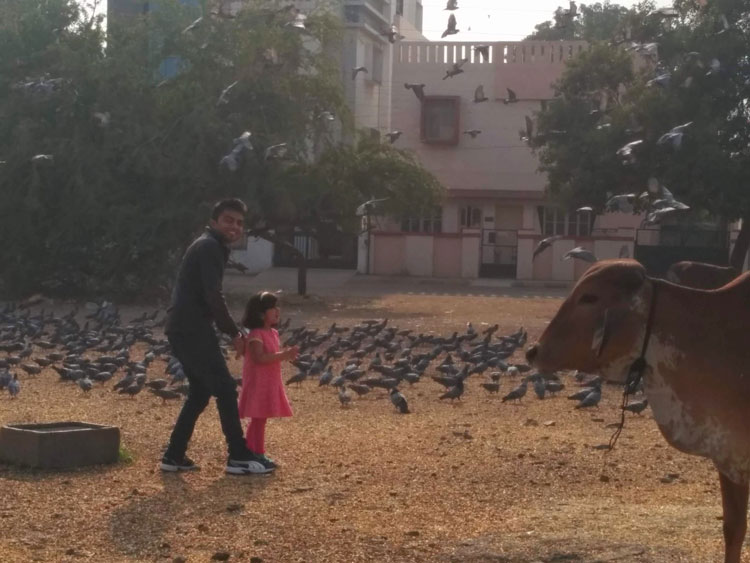 Our columnist’s younger brother and her older daughter offer food donations to animals in 2015 in India. (Photo provided by Pooja Thakkar)