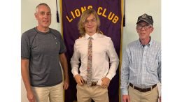 Sheridan Lions Club President Jim Kitchel (left) and member Steve Bilby (right) presented Sheridan High School graduate Ayden Henley (center) with a $500 scholarship at its Wednesday meeting, one of…