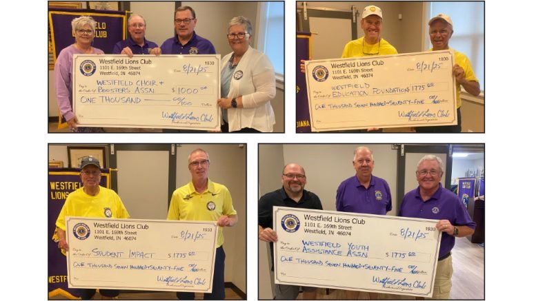 The Lions’ “Fore the Kids” golf outing held at Pebble Brook Golf Course raised funds for four different organizations that work with Westfield children and school students. This year’s recipients of the proceeds from the golf outing were Student Impact, the Westfield Education Foundation, the Westfield Youth Assistance Program, and the Westfield Lions’ WHS scholarship program. The $7,200 raised at the golf outing allowed the Lions to write $1,775 checks to each of these well-deserving organizations.