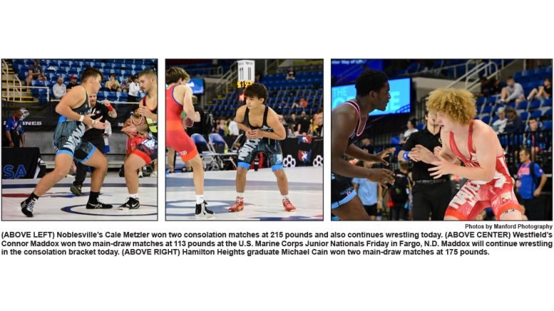 Westfield’s Connor Maddox led the charge for Hamilton County’s five members of the Indiana team with three wins in four matches at 113 pounds. Maddox began with two victories in the main draw, first beating New Jersey’s Logan Forgatch in a 9-0 technical fall in the Round of 128. Maddox scored another technical fall victory in the Round of 64, beating Minnesota’s Will Katherman 9-1.